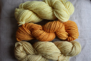 So no making. However this past week has been good for dyeing - I mordanted several skeins last week so have been able to do a quick dye-pot whenever the mood takes me. The 'pot pourri' dye from the other day has turned out a softer, slightly muddier yellow than the anthemis tinctoria one from last Monday, and I followed that up with another onion-skin dye. I love the richness of the onion skin dyes - this was from the big brown onions I use most often - and of course the easiness of it!